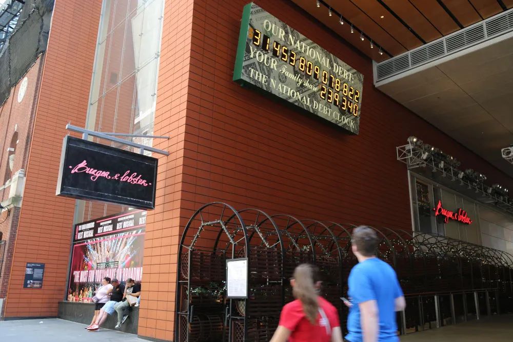 5月29日,人们经过美国纽约曼哈顿的“国债钟”。“国债钟”是一个大型计数器,它实时更新美国的公共债务总额,并显示出每个美国家庭所要负担的数额。新华社记者 刘亚南 摄